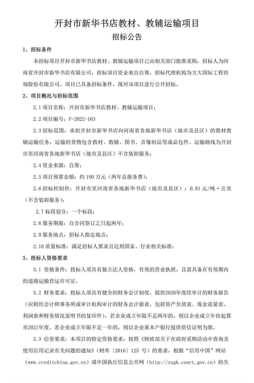 開封市新華書店教材、教輔運輸項目招標公告