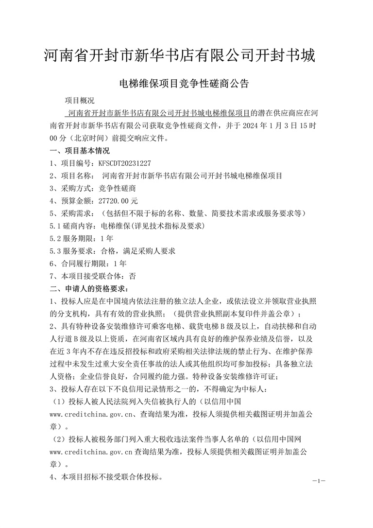 河南省開(kāi)封市新華書(shū)店有限公司開(kāi)封書(shū)城電梯維保項(xiàng)目競(jìng)爭(zhēng)性磋商公告